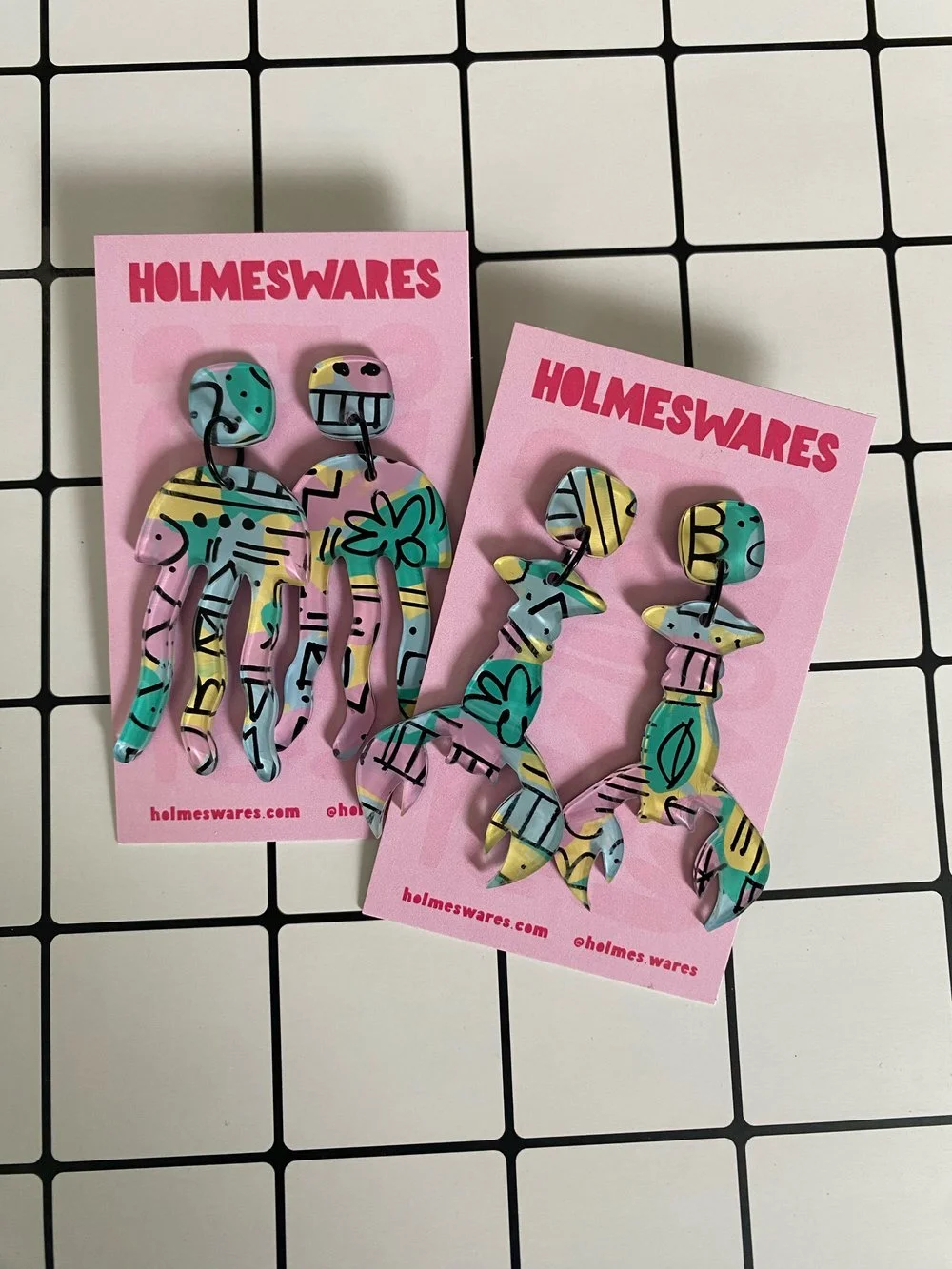 Our earrings are made by hand, from hand-painted acrylic sheets turned into fun, wearable art. Each pair is unique, just like the person who’ll wear them.